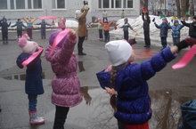 С детьми старших и подготовительных групп провели флеш - моб утреннюю зарядку на улице.