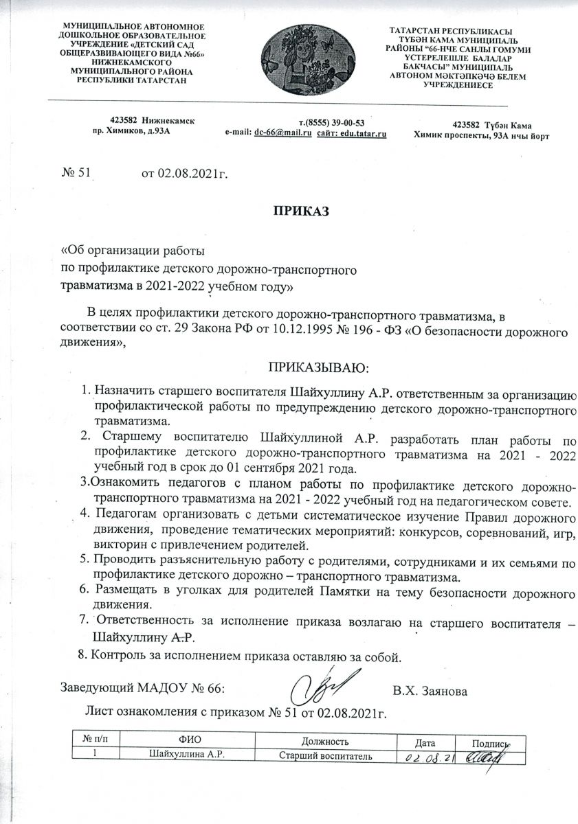 Приказ "Об организации работы по профилактике ДДТТ в 2021-2022 учебном году"