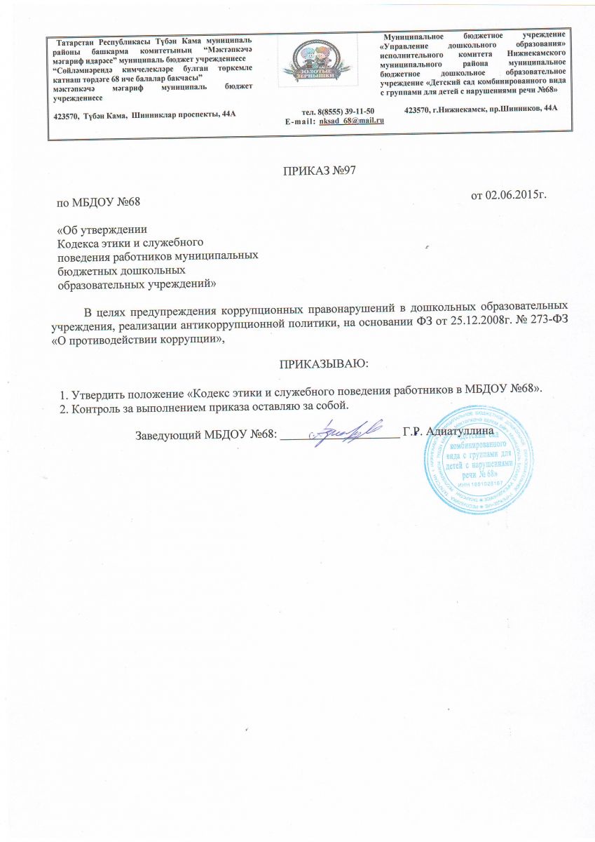 Приказ МБДОУ №68 "Об утверждении Кодекса этики и служебного поведения работников муниципальных бюджетных дошкольных образовательных учреждений"