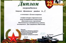Результаты смотра-конкурса строевой песни 26.02.2015 Сегодня прошел финал смотра-конкурса строевой песни среди воспитанников дошкольных образовательных учреждений Нижнекамского муниципального района, посвященного Дню защитника Отечества.Наш детский сад получил Диплом в номинации "Лучшая выправка". МОЛОДЦЫ!