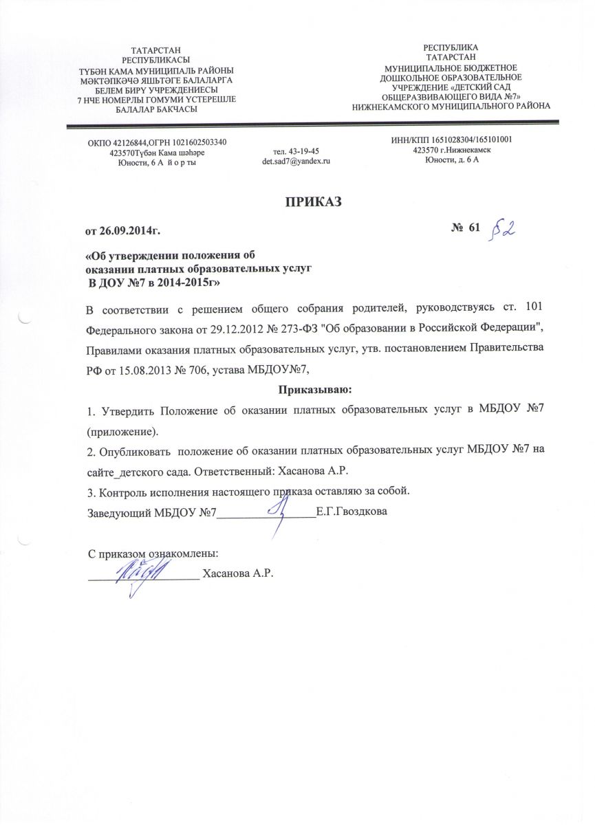 Приказ об утверждении положения об оказании платных образовательных услуг