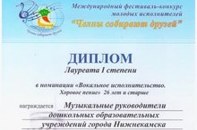Музыкальные руководители ДОУ г.Нижнекамска стали лауретами Диплома l степении Международного фестиваля-конкурса молодых исполнителей "Челны собирают друзей" в номинации "Вокольное исполнительство.Хоровое пение." с произведением "Баллада о лётчицах". Поздравляем Тумаеву Т.Л. и Кириллову-Егорову Л.И. с заслуженной победой.