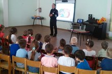 4.10.16 была организована встреча с сотрудником ГИБДД. Дети старших и подготовительных групп просмотрели обучающий мультфильм по правилам дорожного движения.