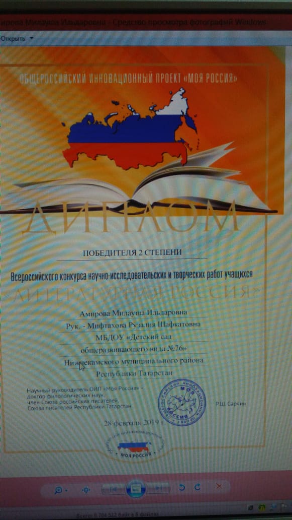 28. 02. 2019 года воспитанники нашего сада приняли участие во Всероссийском конкурсе научно-исследовательских и творческих работ учащихся, и были награждены дипломом победителя I степени- Хазиахметов Булат Фаритович, и Дипломом победителя II степени - Нуриева Азалия Наилевна, Оребердиева Радмила Раджаповна, Амирова Миляуша Ильдаровна. Поздравляем!!! Желаем дальнейших творческих успехов и побед!