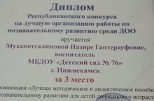 Наш педагог Мухаметгалимова Назира Гаптерауфовна приняла участие в республиканском конкурсе на лучшую организацию работы по познавательному развитию среди ДОО и удостоилась Диплома 3 степени. Поздравляем ее и желаем дальнейших творческих успехов!