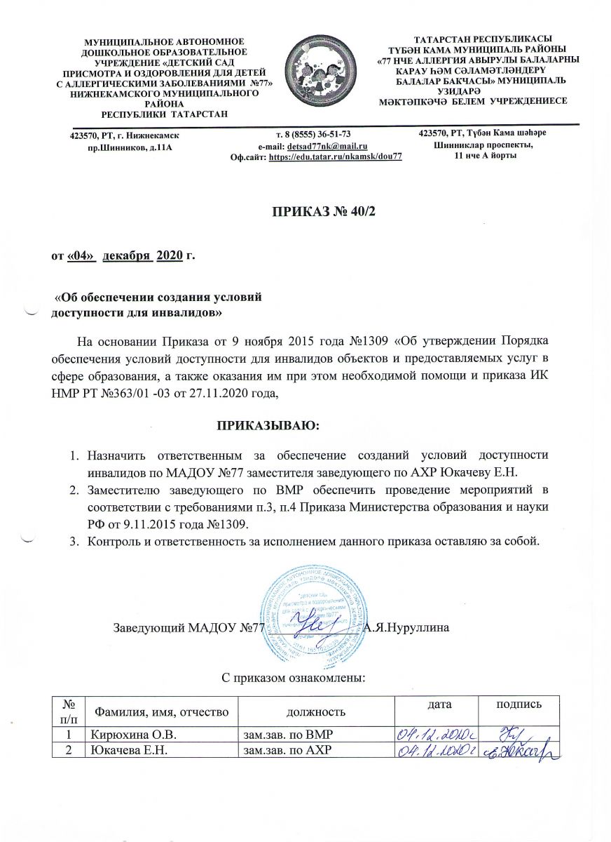 - Должностная инструкция ответственного сотрудника за организацию работы по обеспечению доступности объекта и услуг и инструктаж персонала в МАДОУ№77