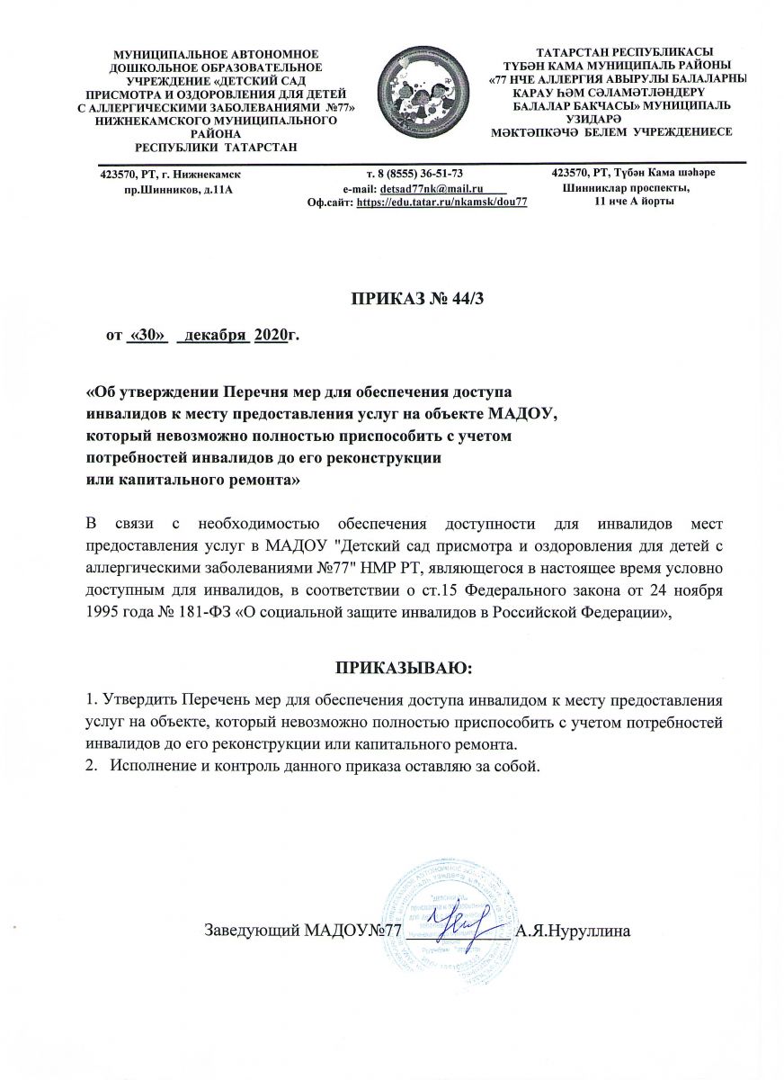 - Приказ Об утверждении Перечня мер для обеспечения доступа инвалидов к месту предоставления услуг на объекте МАДОУ, который невозможно полностью приспособить с учетом потребностей инвалидов до его реконструкции или капитального ремонта