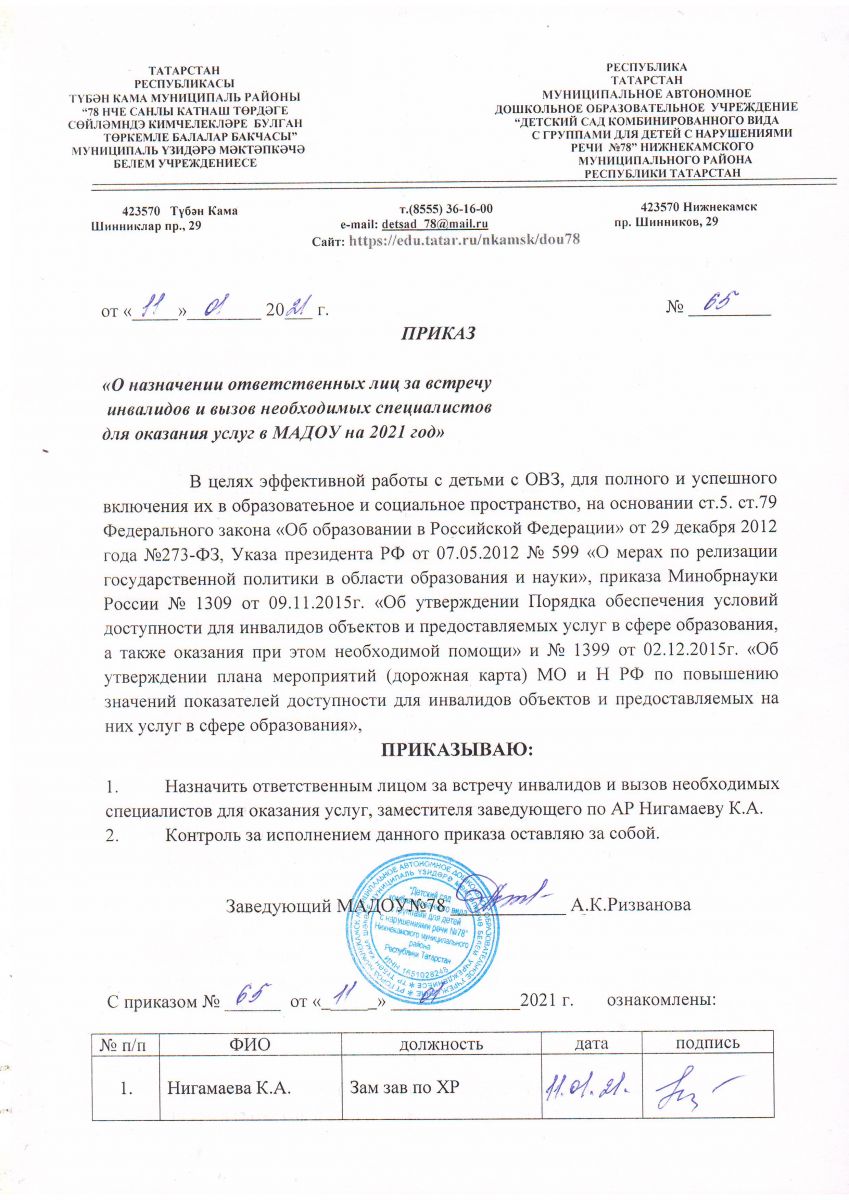 - Приказ "О назначении ответственных лиц за встречу инвалидов и вызов необходимых специалистов для оказания услуг в МАДОУ на 2021"