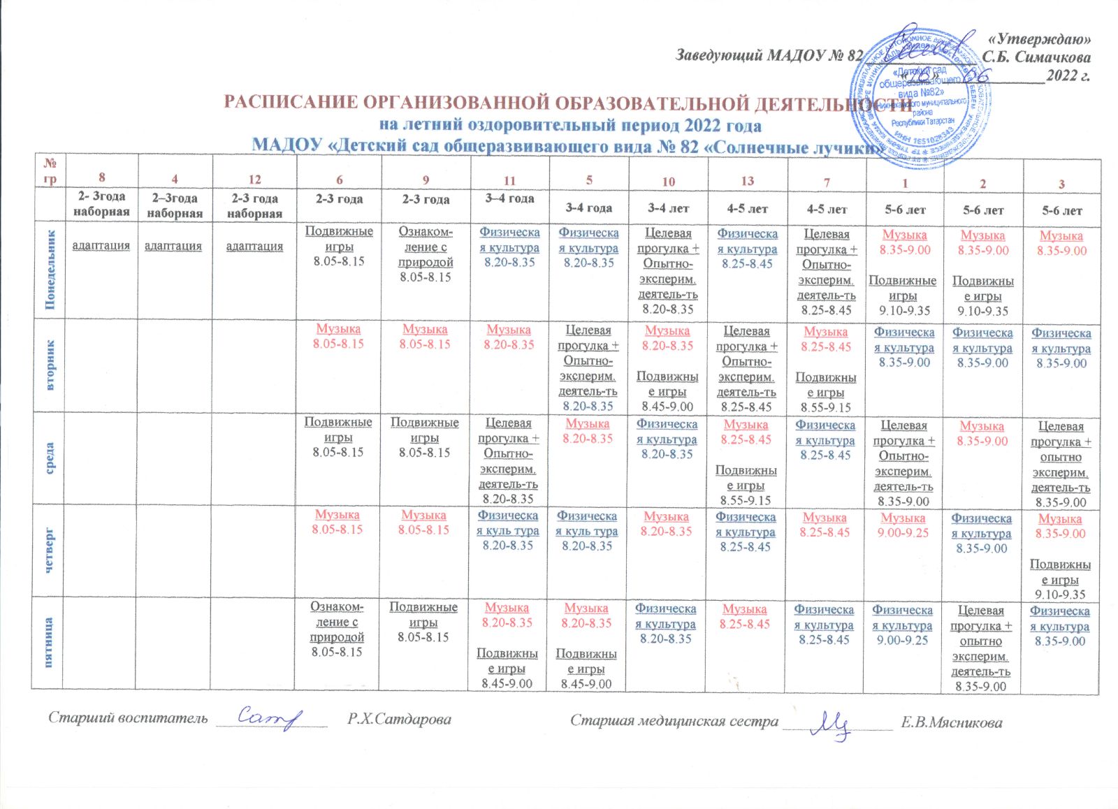 Расписание ООД на летний оздоровительный период 2022г.