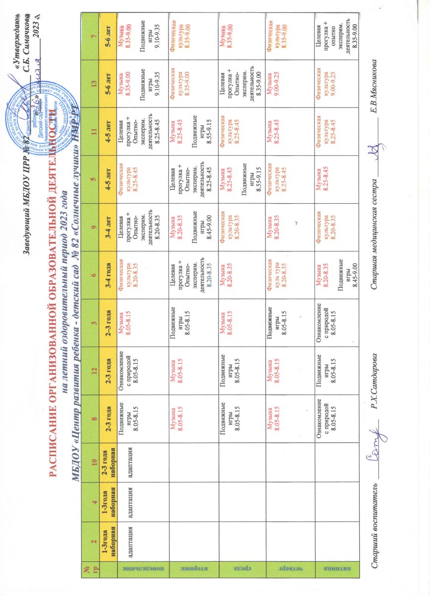 Расписание ООД на летний оздоровительный период 2023.