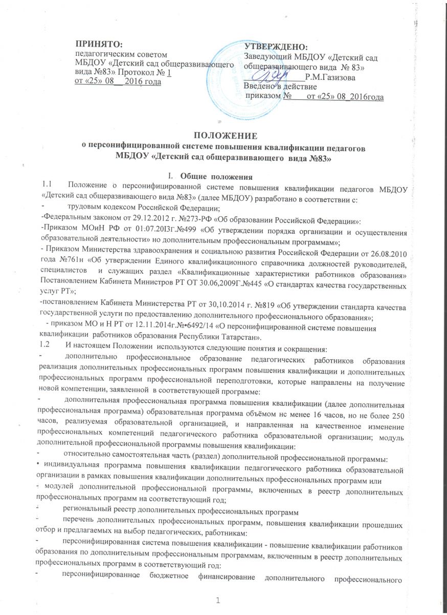 Положение о персонифицированной системе повышения квалификации педагогов МБДОУ №83