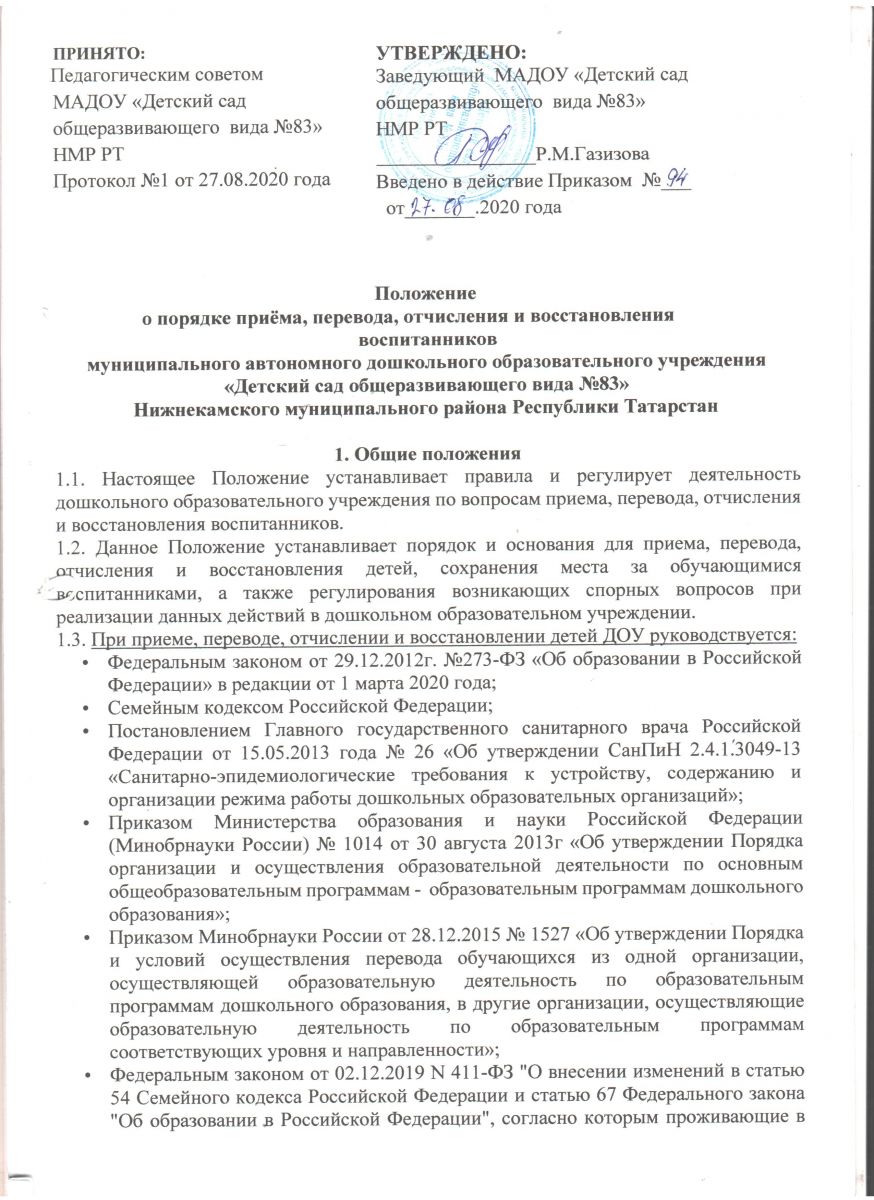 Положение о порядке приёма, перевода, отчисления и восстановления воспитанников МАДОУ №83