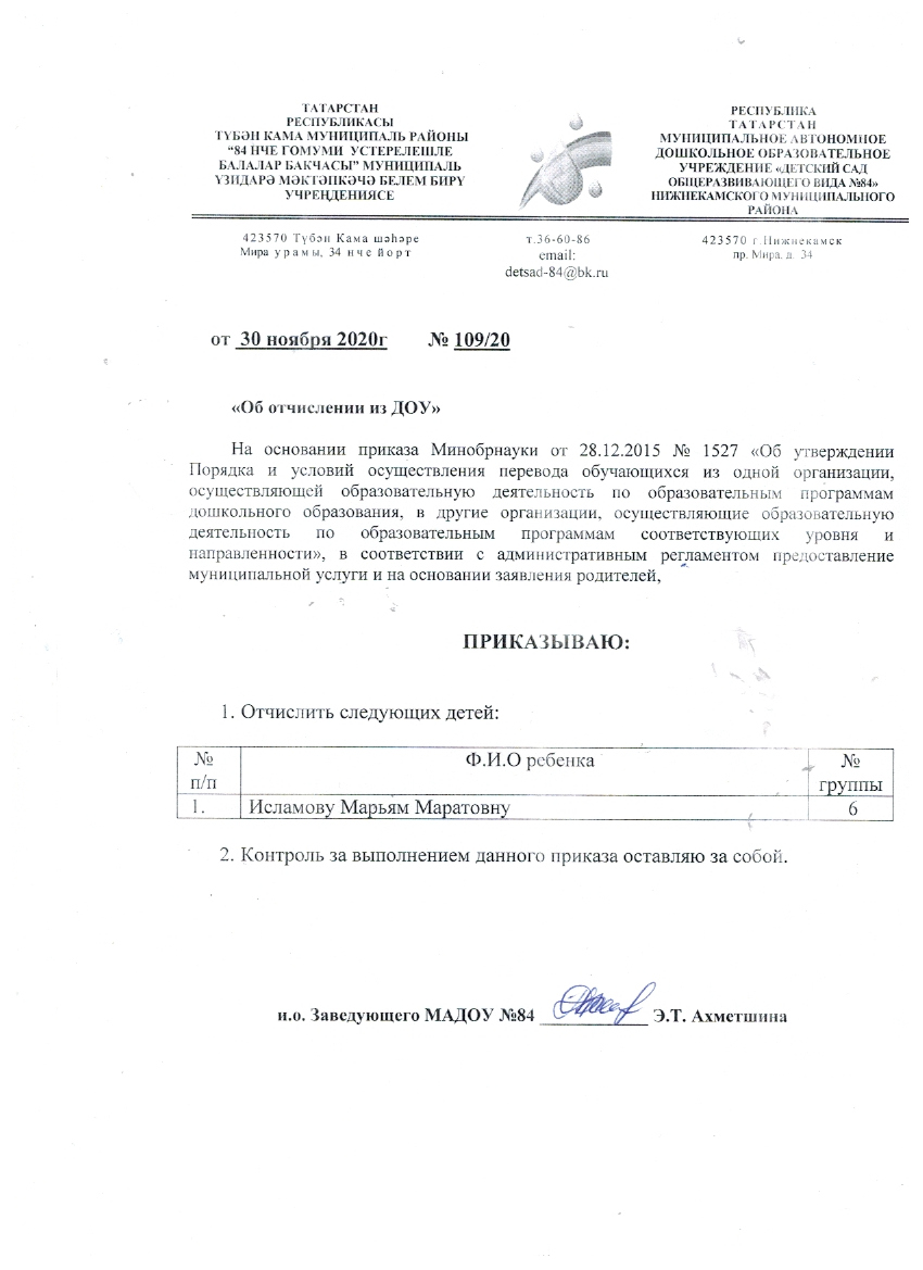 Отчисление детей из ДОУ. Ноябрь 2020
