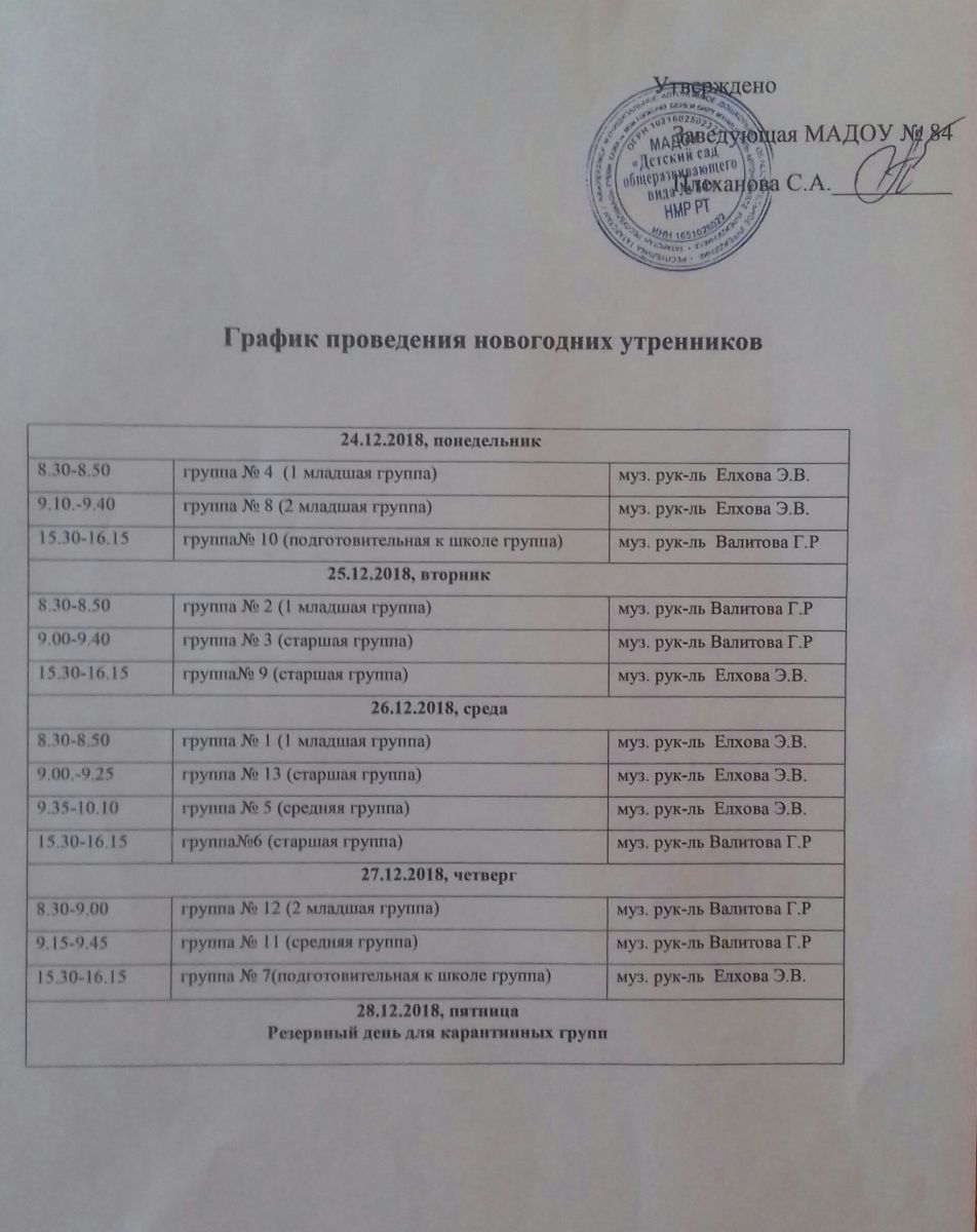 Опубликовано: 11.12.2018Уважаемые родители! У нас в саду началась активная подготовка всего педагогического коллектива к долгожданной встрече воспитанников с нарядной Елкой и Дедом Морозом! С большой радостью приглашаем Вас всех на наши новогодние праздники, которые пройдут согласно утвержденного графика.