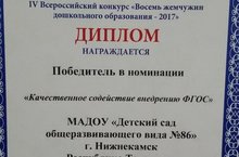 В рамках IV Всероссийского конкурса "Восемь жемчужин дошкольного образования - 2017" наше дошкольное учреждение награжден Дипломом победителя в номинации "Качественное содействие внедрению ФГОС".