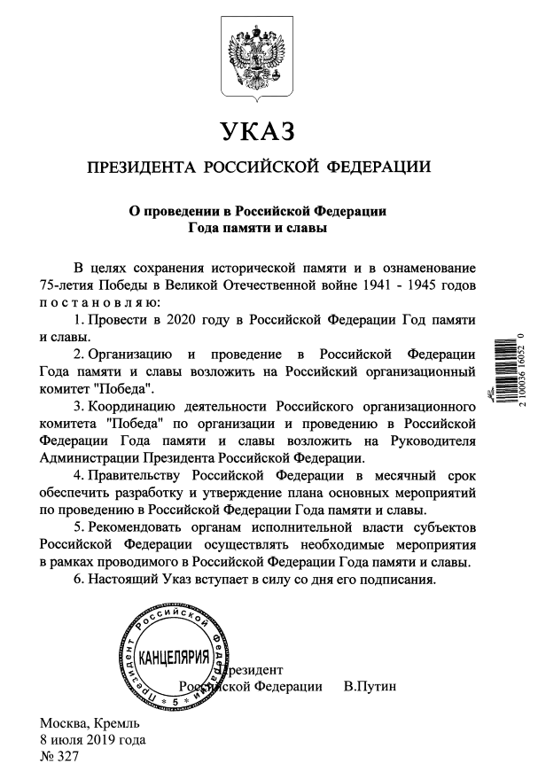Указ президента РФ о проведении в РФ Года памяти и славы