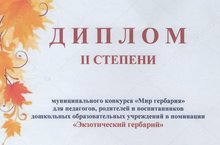На базе МБДОУ №37 прошел муниципальный конкурс "Мир гербария". В конкурсе приняло участие 44 детских сада. Наш детский сад представили творческое трио группы №2 (категория педагог-родитель-воспитанникОУ): семья Фаттаховых, дочь Эльвина и мама Вера Борисовна, воспитатель Рахманова С.А. Участники приняли участие в номинации "Экзотический гербарий" под названием "Море зовет, волна поет...". По итогам наши участники заняли 2 место. Поздравляем!!!