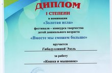 Сегодня, в МБДОУ №75, прошла церемония награждения победителей муниципального фестиваля- конкурса для детей с ОВЗ "Вместе мы сможем больше". Данный фестиваль в нашем городе проводиться уже не первый год, приурочен он к Декаде инвалидов. Целью Фестиваля является создание условий для реализации творческого потенциала и социализации детей с ограниченными возможностями здоровья. Воспитанница старшей группы №3 ,Гибадуллина Эзель, получила на фестивале - главный приз , 1 место , в номинации "Золотая игла" за работу "Кошка и мышонок". Поздравляем!!!