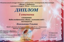 Подведены итоги V Регионального конкурса детского творчества, посвященный Дню матери "Маме с любовью". Организаторы конкурсы КФУ г. Елабуга и ДЕтский сад №6 г. Менделлевск. В этом конкурсе у нас приняла участие воспитанница группы №2 Князькова Ульяна. В номинации Видео поздравление "Мама-солнышко мое!" участница получила диплом 1 степени. Поздравляем!!!