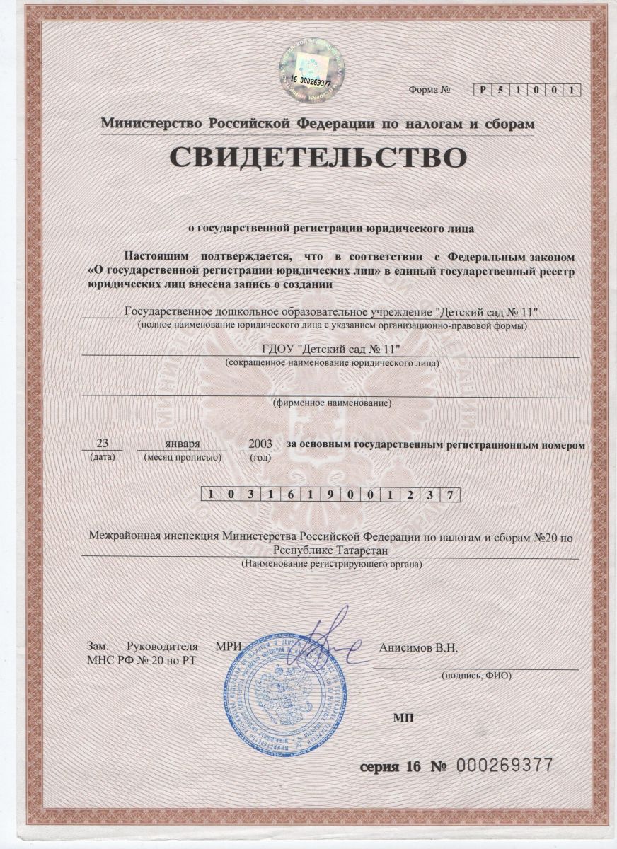 Свидетельство о внесении записи в ЕГР