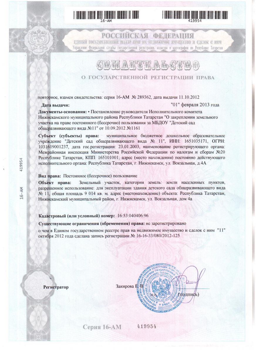 Свидетельство о государственной регистрации на земельный участок jpg