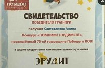 Саитгалиева Алина, воспитанница подготовительной к школе группы №7 - победитель Гран-При конкурса "Помним! Гордимся!", посвященный 75-ой годовщине Победы советского народа в Великой Отечественной Войне. Поздравляем!!!