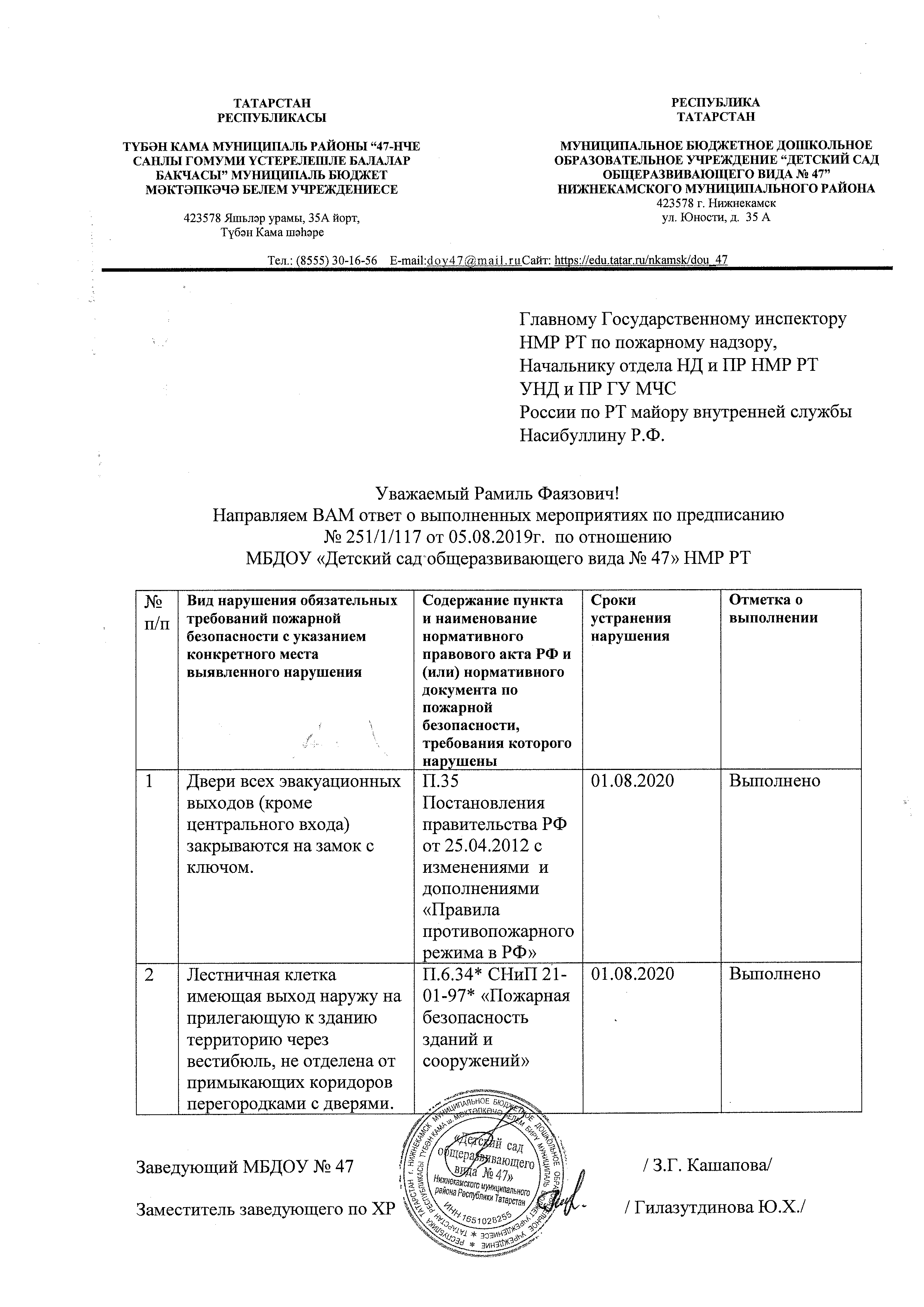 Предписание№ 251/1/117 от 06.08.2019 об устранении нарушений требований пожарной безопасности.