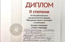Поздравляем ученицу 9А класса Хабибуллину Эллину, ставшую призёром ( 2 место) VII Республиканского лингвистического форума в номинации «Конкурс переводов «Тайны перевода» по французскому языку, проведённого на базе Института международных отношений (КФУ) в городе Казань. Выражаем благодарность учителю французского языка Забировой Розалии Рафкатовне!