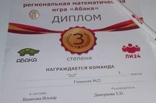 Поздравляем команду "2х2" 5Б класса (Вахитов Ильнар, Хафизов Рамзиль, Гарифуллин Амир, Талыпов Азамат, руководитель Дмитриева Т.П.) с 3 местом в региональном чемпионате по математической игре «Абака» !
