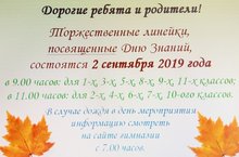 Торжественные линейки, посвященные Дню знаний состоятся 2 сентября 2019 года в 9.00 часов для 1-х, 2-х, 3-х, 5-х, 8-х, 9-х, 11-х классов, в 11.00 часов для 2-х, 4-х, 6-х, 7-х, 10-ого классов.
