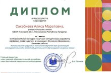 Поздравляем Сахабиеву Алису Маратовну, учителя химии и биологии с ПОБЕДОЙ во Всероссийском конкурсе на лучшую методическую разработку "Цифровая среда педагога"