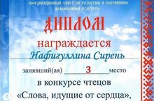 Поздравляем Нафигуллину Сирень, ученицу 1б класса, (классный руководитель Низамутдинова Резеда Мавлитовна), занявшая 3 место в конкурсе чтецов "Слова, идущие от сердца", приуроченного к славянской письменности и культуре.
