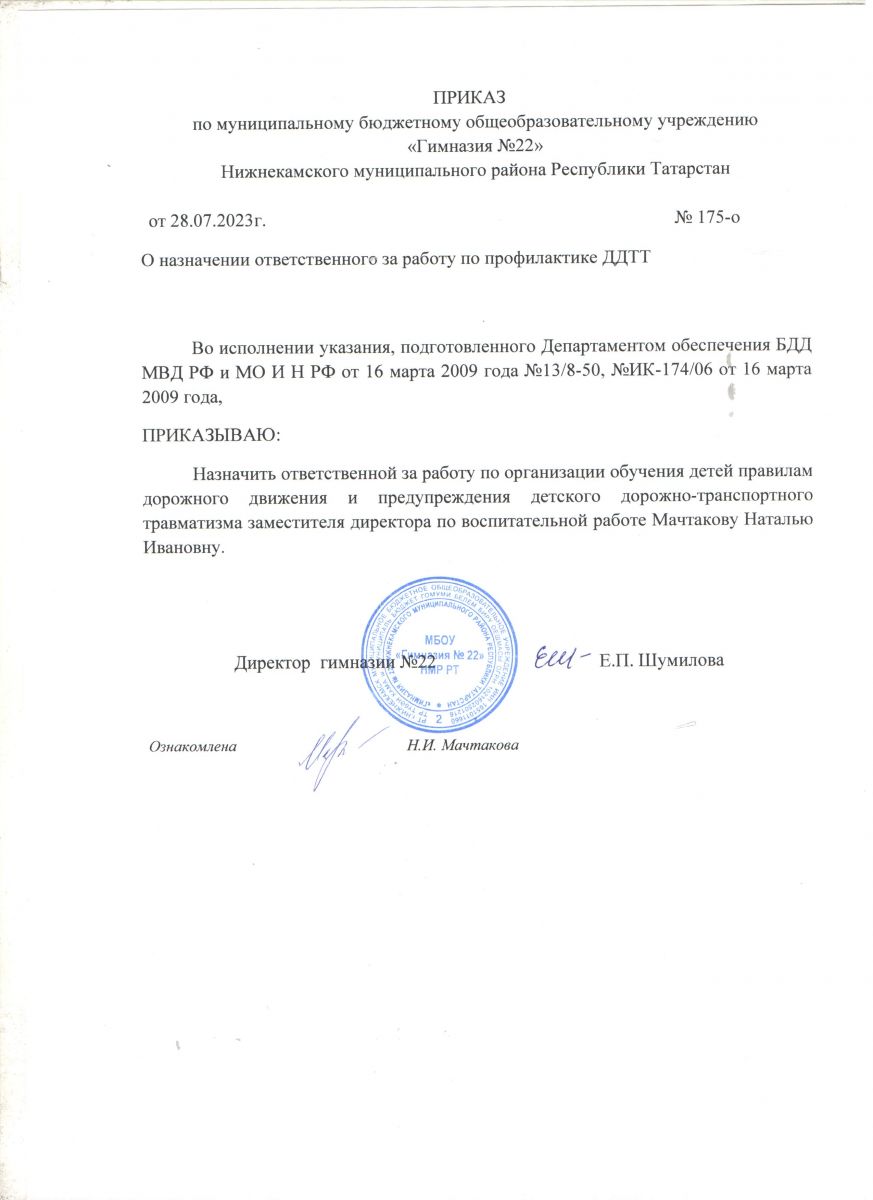 Приказ о назначении ответственного по профилактике ДДТТ 2023-2024