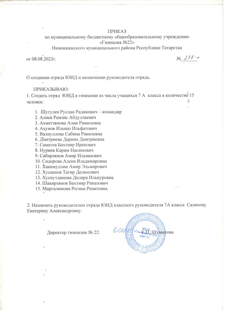 Приказ о создании отряда ЮИД в МБОУ "Гимназия №22№ НМР РТ на 2023-2024 учебный год