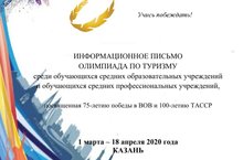 ОЛИМПИАДА ПО ТУРИЗМУ среди обучающихся средних образовательных учреждений и обучающихся средних профессиональных учреждений, посвященная 75-летию победы в ВОВ и 100-летию ТАССР заявки до 20 марта (9-11 класс)