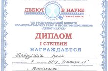 Ученица 7 класса Шайдуллина Адиля заняла первое место в VIII Республиканском конкурсе исследовательских работ и проектов школьников «Дебют в науке».