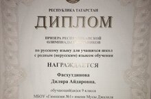 17 февраля в городе Казань прошёл заключительный этап республиканской олимпиады школьников,на котором выступила одна из лучших учениц гимназии- Фасхутдинова Диляра.Она вновь стала призёром данной олимпиады!Мы поздравляем её с высоким результатом и желаем ей и подготовившему её учителю, Заляловой Венере Иршатовне, дальнейших творческих успехов! Гордимся вами!