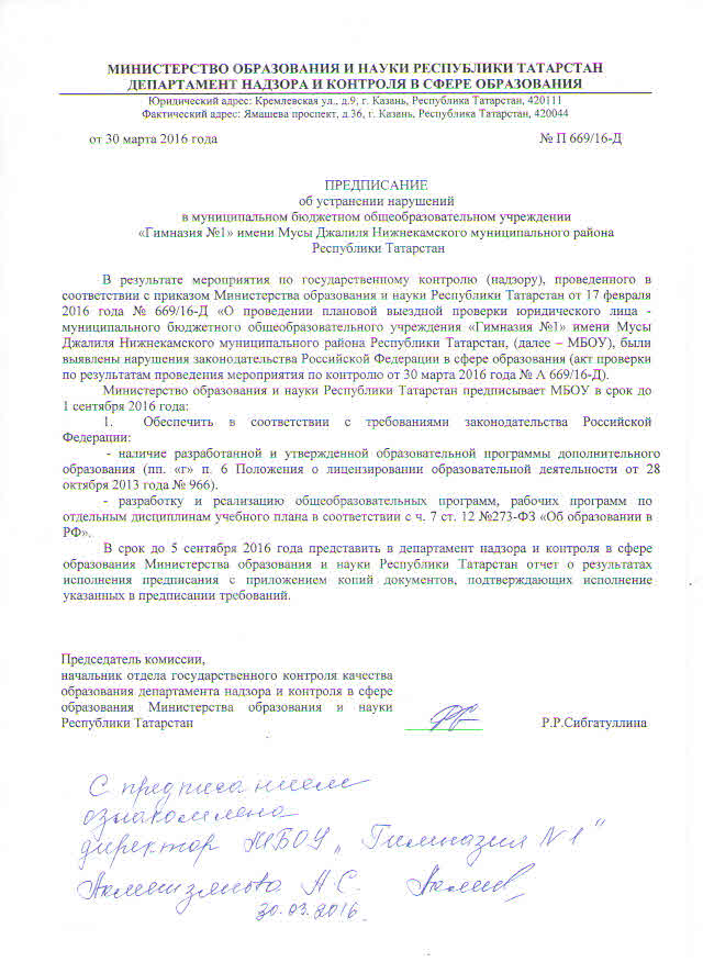 Предписания Департамента надзора и контроля в сфере образования РТ по устранению нарушений 2021г