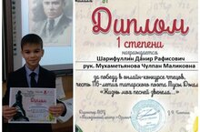 4 в сыйныф укучысы Шәрифуллин Данир (җитәкчесе Мухаметьянова Ч.М.) татар шагыйре Муса Җәлилнең 116- еллыгы уңаеннан "Тормыш минем җырым белән яңгырады..." әдәби конкурсында 1 нче урынны яулады. Молодец. Котлыйбыз.