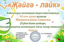 2 а сыйныфында укучы Миңнегалиев Саматны "Җәйгә-лайк "бәйгесендә катнашып, 3 урын алуы белән котлыйбыз. Молодец. Уңышлар -