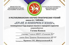 Гатина Камила заняла 2 место в X Республиканских научно-практических чтениях имени А.С.Тайсина "Край в котором я живу" , посвященных Году родных языков и народного единства. Руководители Шаймухаметова Ф. М. И Муратова Л.М.