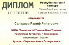 Поздравляем Салахиева Ралифа с победой в Республиканском конкурсе "Волшебный мир сказок и стихов Габдуллы Тукая" в номинации "Поэзия". Руководитель: Зарипова А.Г. Желаем дальнейших творческих успехов!