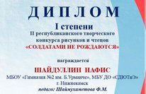В целях воспитания у обучающихся интереса к отечественной истории, уважения к героическому прошлому нашей страны, развития творческого потенциала, повышения роли изобразительного искусства в военно-патриотическом воспитании обучающихся, развития и поддержки талантливых детей в области художественного творчества, формирования положительного эмоционального отношения к литературным поэтическим произведениям патриотической тематики, приобщения детей и подростков к литературно-художественному наследию, отражающему величие нашей культуры был проведен II Республиканский творческий конкурс рисунков и чтецов «Солдатами не рождаются», посвященный 75-летию Победы в Великой Отечественной войне. Учащийся 9 а класса Шайдуллин Нафис в старшой возрастной группе в номинации «Конкурс чтецов» занял I место. Поздравляем Шайдуллина Нафиса и Шаймухаметову Ф.М. с победой и желаем дальнейших творческих успехов.