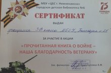 Учащиеся 3В класса получили сертификат Нижнекамской городской библиотеки за участие в акции "Прочитанная книга о войне - наша благодарность ветерану"