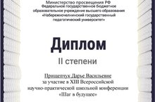 Поздравляем Прищепчук Дарью, ученицу 9г класса, занявшую 2 место в XIII Всероссийской научно - практической школьной конференции "Шаг в будущее". Руководители: Еремина Н. М., учитель родного языка и литературы, Булатова А. Ф., учитель родного языка и литературы. Молодцы!