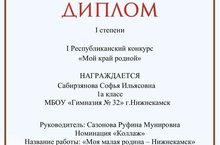 Поздравляем ученицу 1 А класса Сабирзянову Софью, занявшуй 1 место в первом Республиканском конкурсе "Мой край родной". Софья представла свою работу, в которой рассказала о своей малой Родине - городе Нижнекамске. Кл. руководитель - Сазонова Р.М.