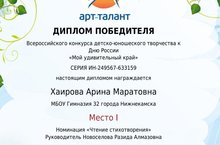 Поздравляем Хаирову Арину, ученицу 1в класса, победителя в номинации «Чтение стихов» во Всероссийском конкурсе детско – юношеского творчества к Дню России «Мой удивительный край».
