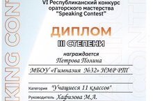 Поздравляем Петрову Полину, ученицу 11а класса и ее руководителя Хафизову Маргариту Амирхановну, учителя английского языка с получением диплома 3 степени в VI Республиканском конкурсе ораторского мастерства "Speaking Contest". Гордимся вашими успехами и желаем дальнейших побед!!!