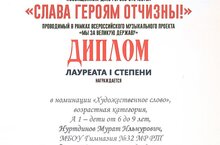 Поздравляем Нуртдинова Мурата, ученика 2в класса, победителя Всероссийского открытого конкурса чтецов, посвященного Дню Героев Отечества "Слава Героям Отчизны". Выражаем благодарность учителю начальных классов Карповой Наталие Николаевне. Молодцы! Гордимся вашими успехами!