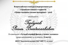 В октябре-ноябре 2019 года в целях реализации Государственной программы «Патриотическое воспитание граждан Российской Федерации на 2016-2020 годы» Академия инновационного образования и развития провела всероссийский конкурс «Права человека глазами молодежи 2018». В январе 2019 года подведены результаты. Обучающийся 11 класса Горбунов Раиль и учитель истории и обществознания Григорьева С.Р. завоевали 2 место. Поздравляем с Победой!!!